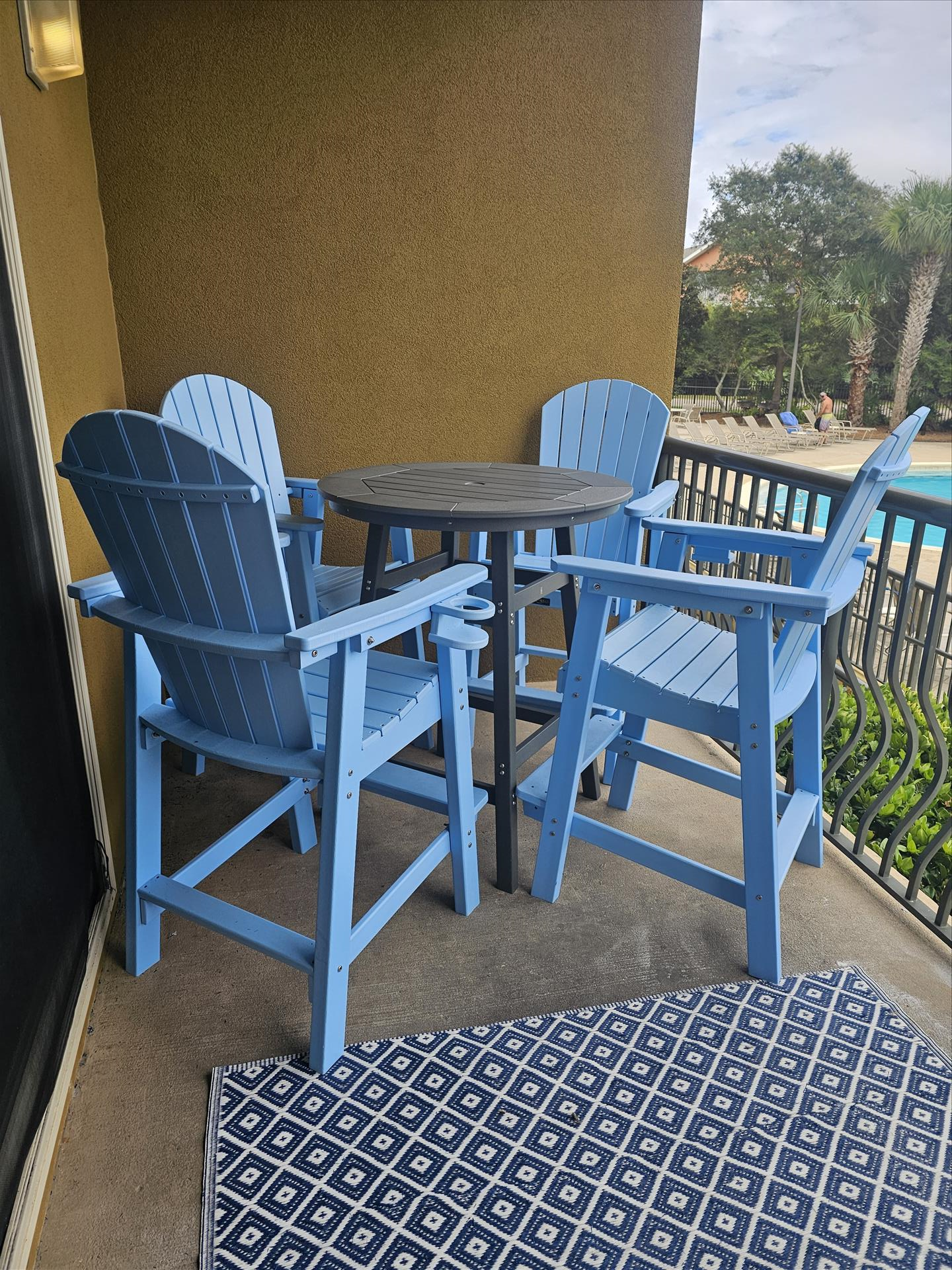 HOA and Property rules state: No RV's or trailers of any kind are allowed to be parked in the community parking area.  No hanging any items including towels and bathing suits on balcony railings.