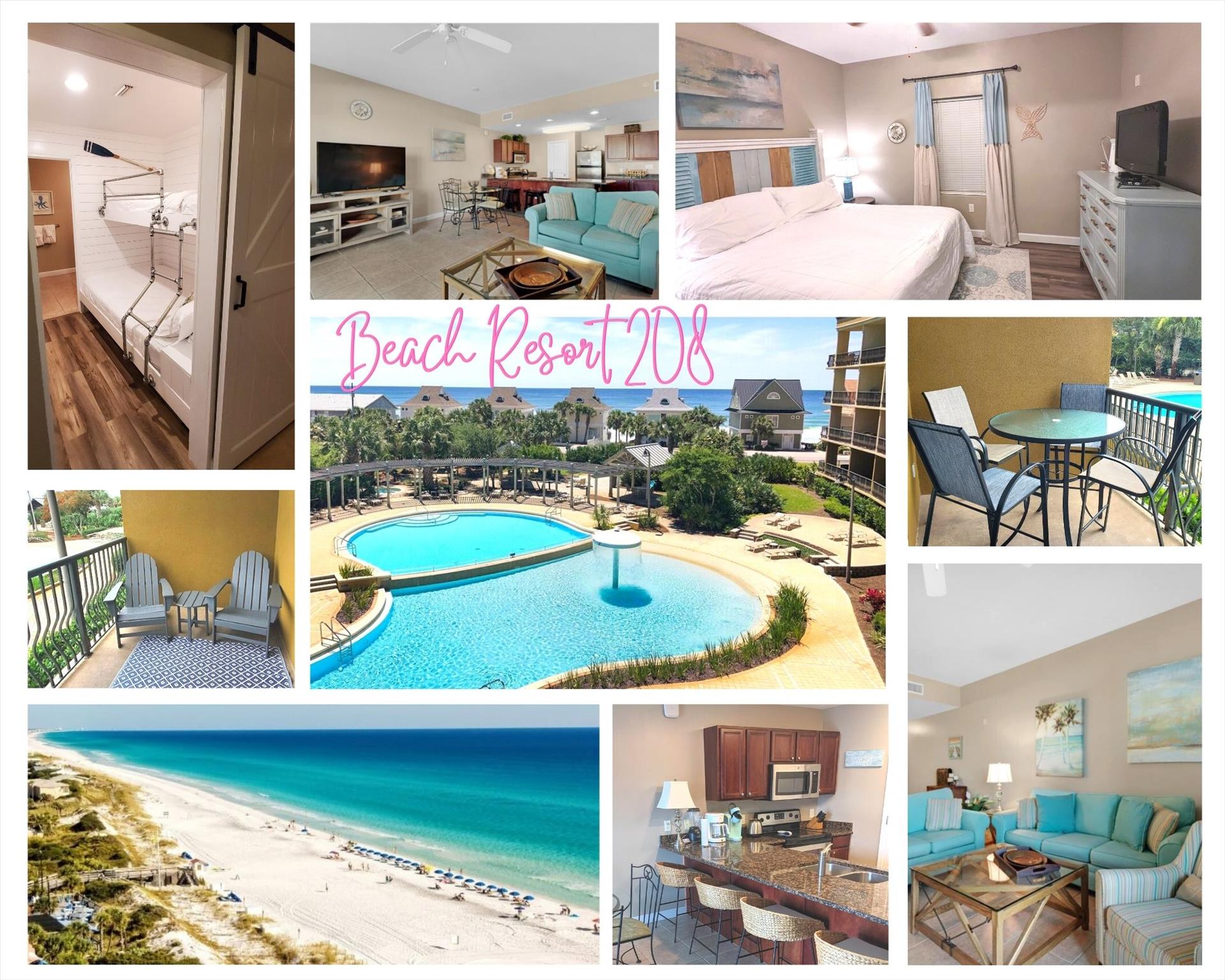Our Condo, Saltwater Retreat, is located at Beach Resort Unit 208 in Miramar Beach, Florida just east of the Destin and Fort Walton area. This ideal location considered part of the 30a scenic communities is the perfect place to relax surrounded by lush landscaping and miles of white sandy beaches and emerald waters. It doesn’t get any better than this! The unit features a fully-stocked kitchen and coastal-themed living area with plenty of room to dine and unwind for an amazing and peaceful vacation oasis.