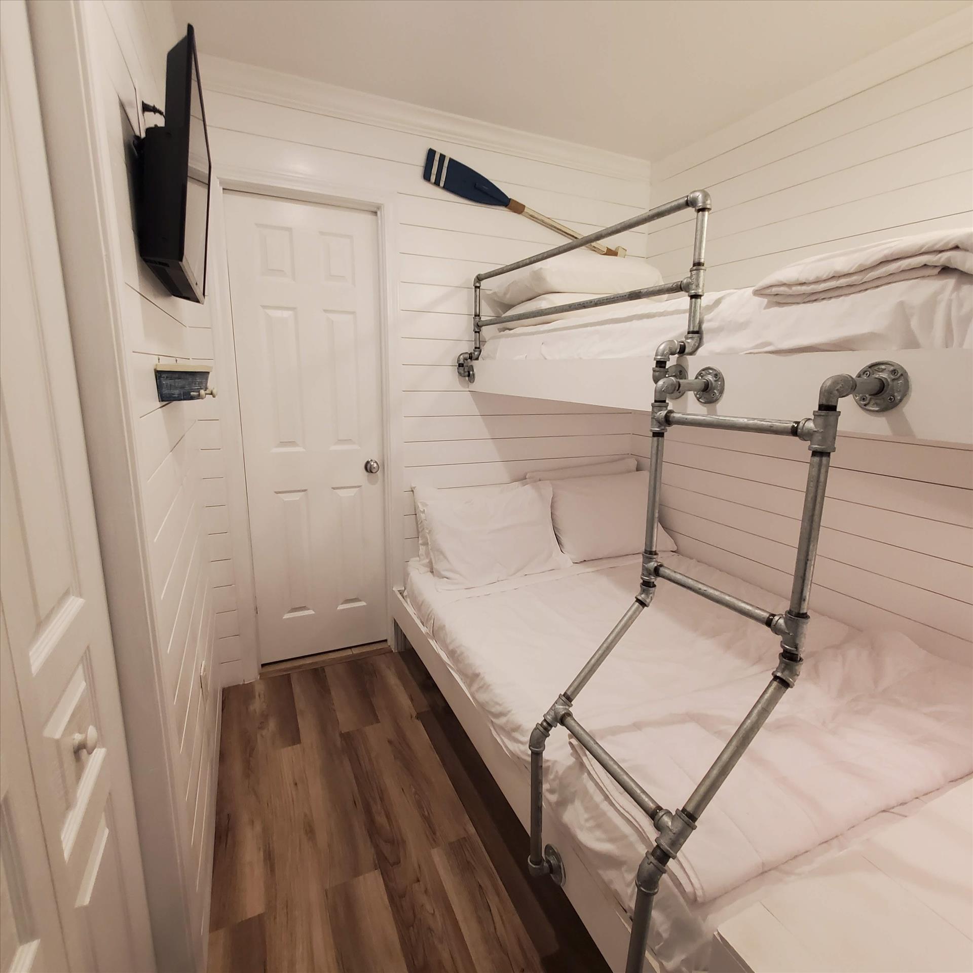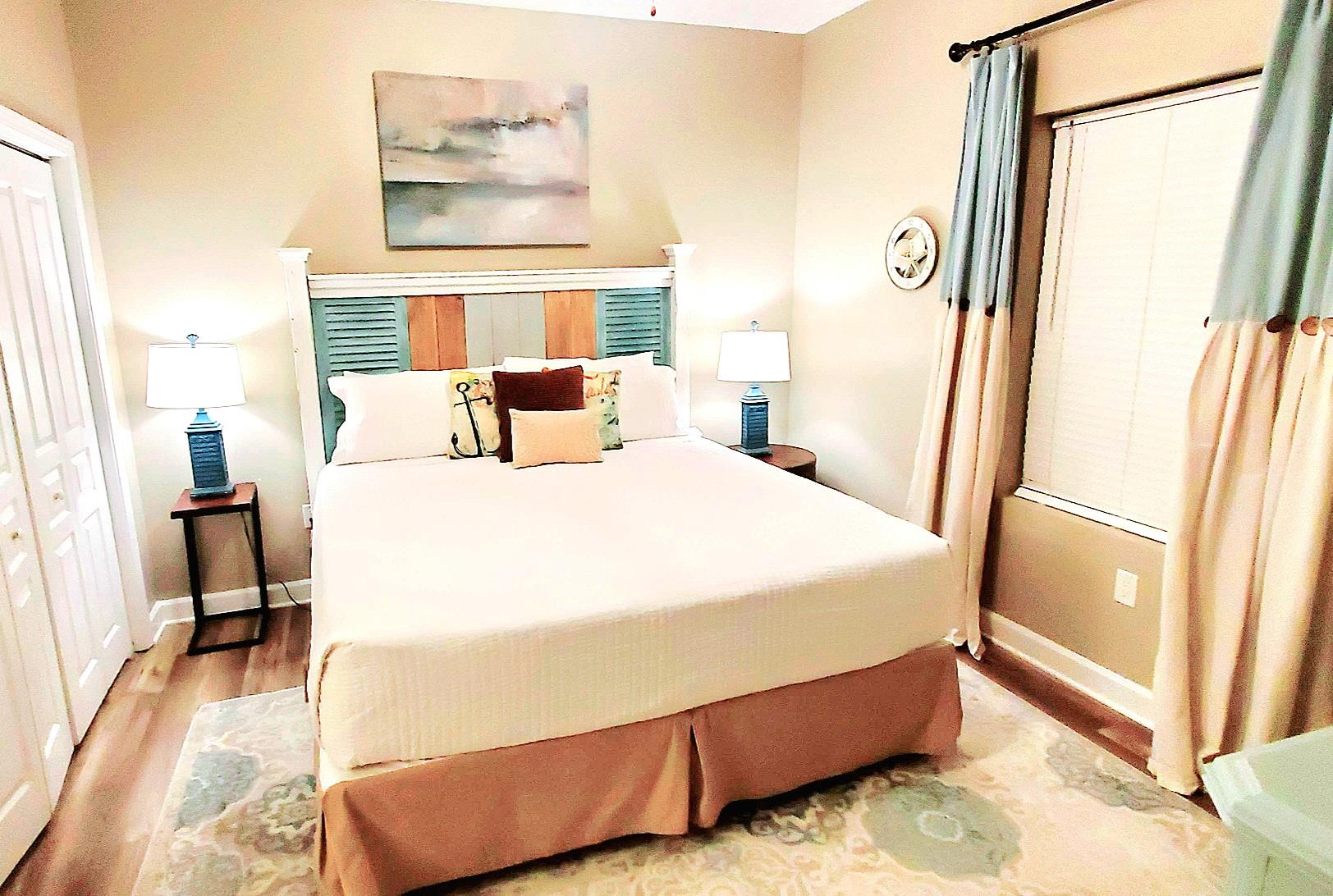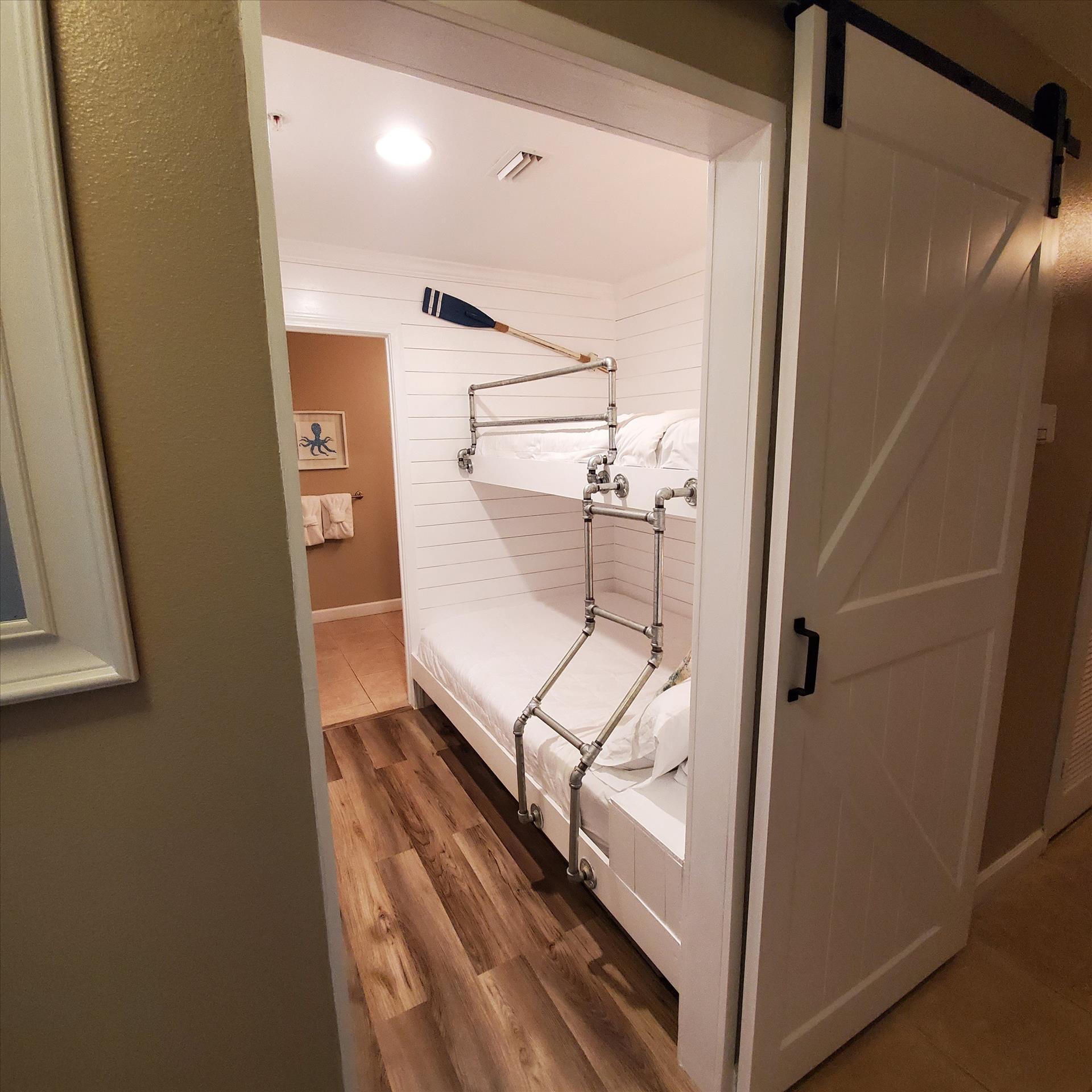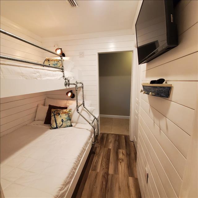 A king-size bed, coastal furnishings, smart TV, large closet, and private bathroom highlight the master suite. There is also an adorable bunkroom with a built-in single over double bunk bed, closet, smart TV, and large guest bathroom. If more sleeping arrangements are needed, the living room couch boast a queen pull-out bed allowing this unit to comfortably sleep 7 people.