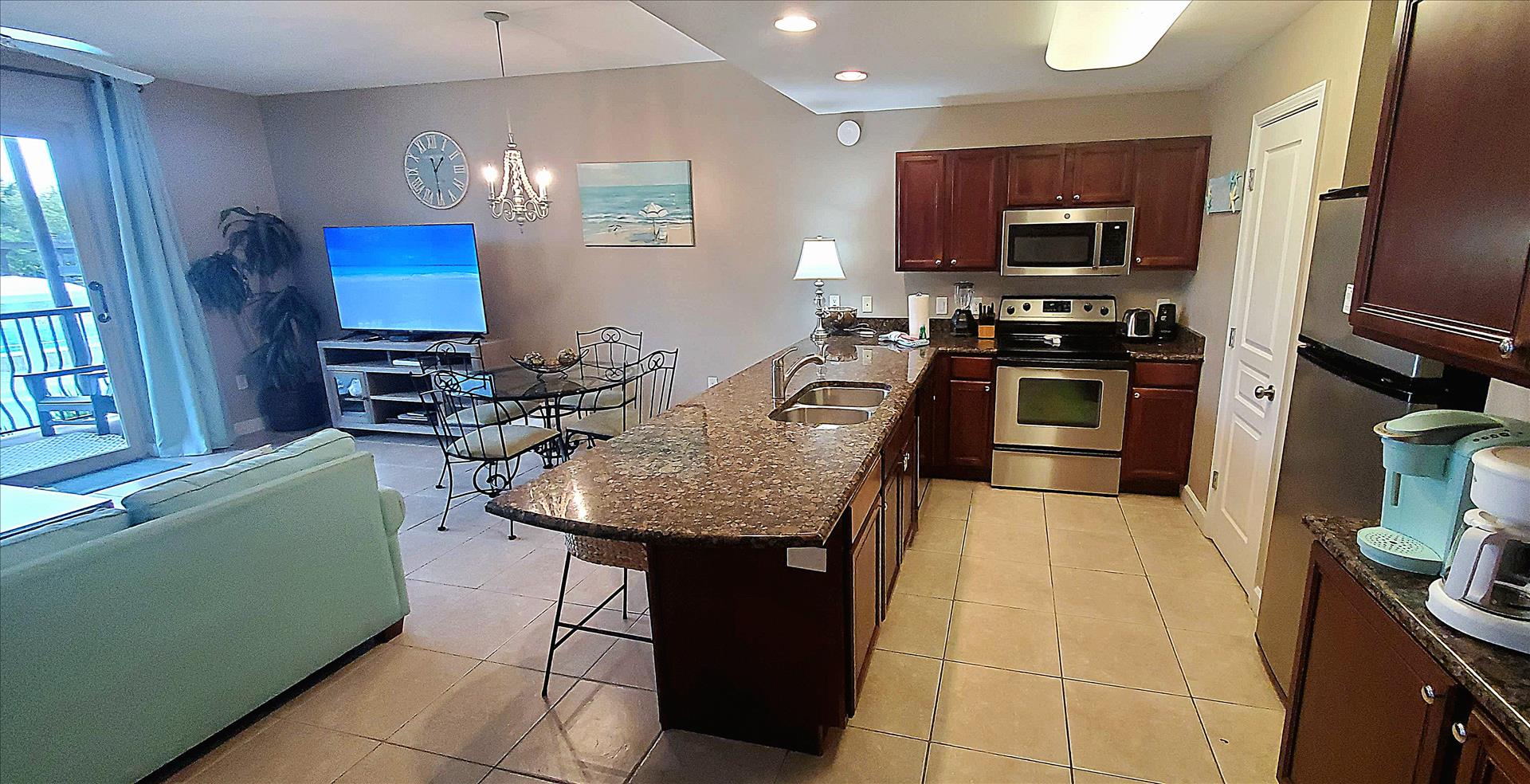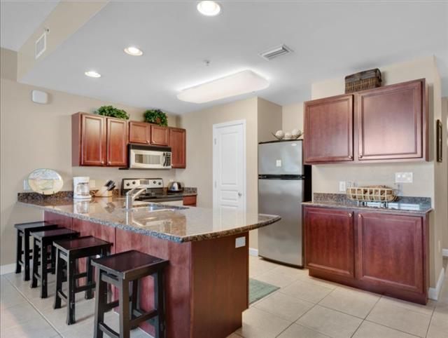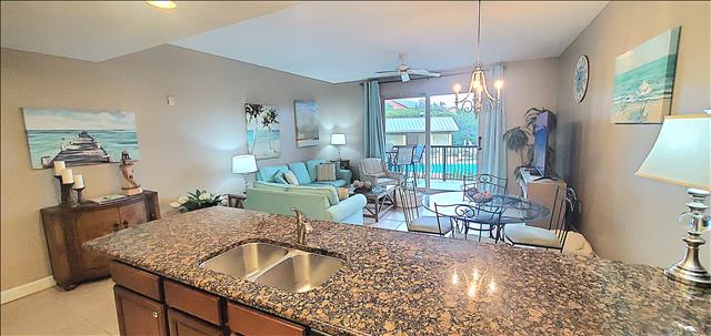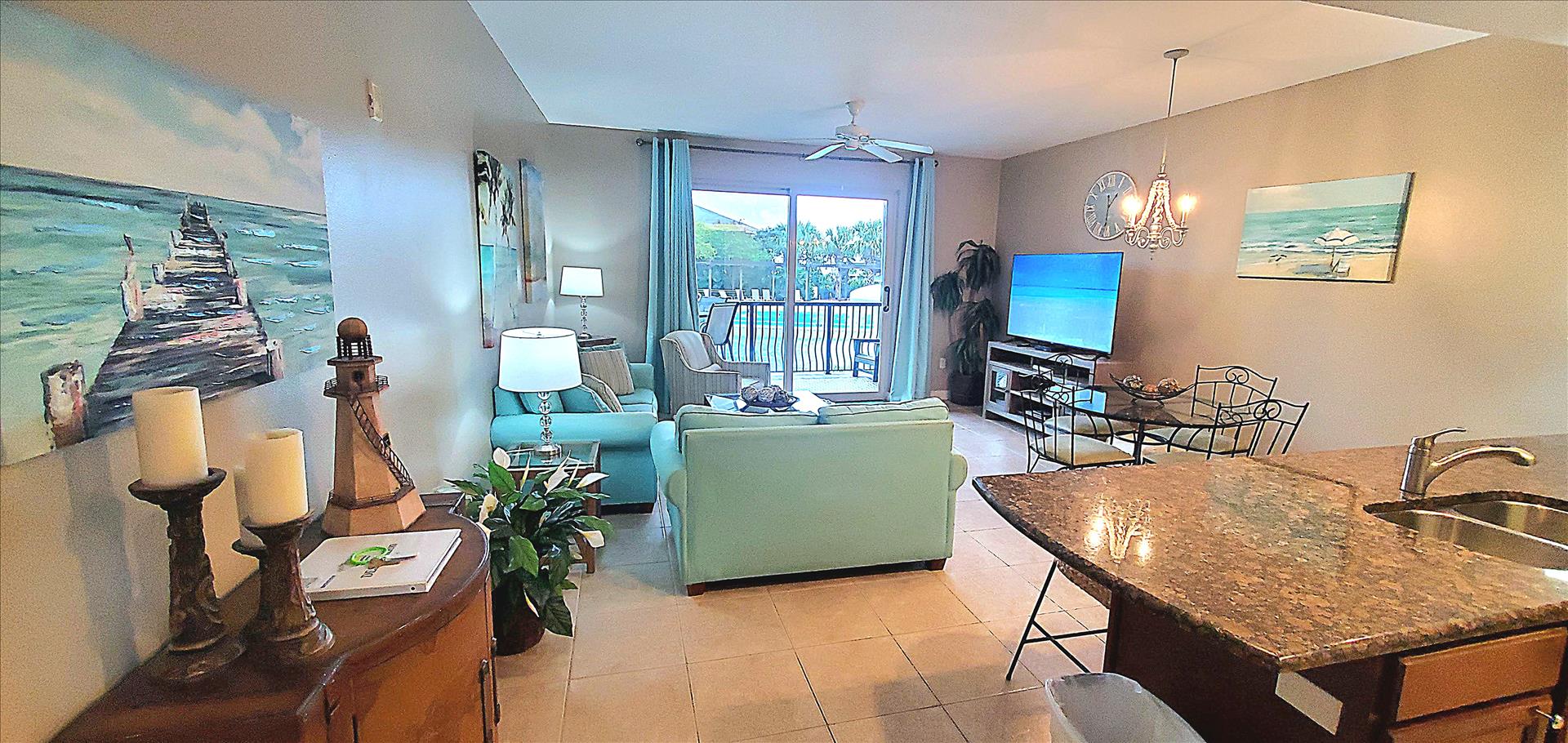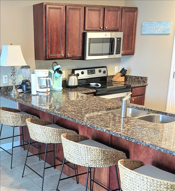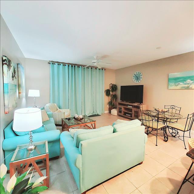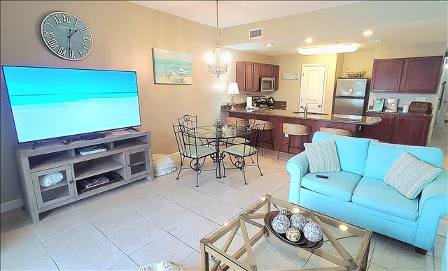 Our condo's spacious open living room features a classic coastal feel with plenty of seating, entertaining area, smart TV, dining table, and additional seating at the granite kitchen bar. The kitchen is fully equipped and has all the amenities needed to cook your favorite meals while away from home. It is an ideal place to relax after a long day full of sun and sand on the beautiful surrounding beaches, or you can choose to relax with a glass of wine on the balcony overlooking the gorgeous pools and water features while the sun sets in the distance over the horizon.