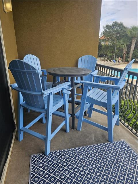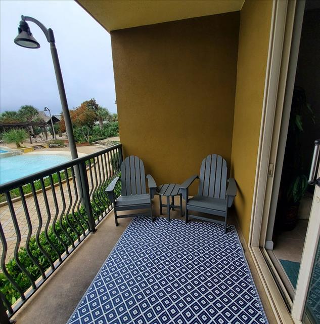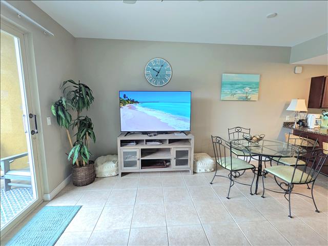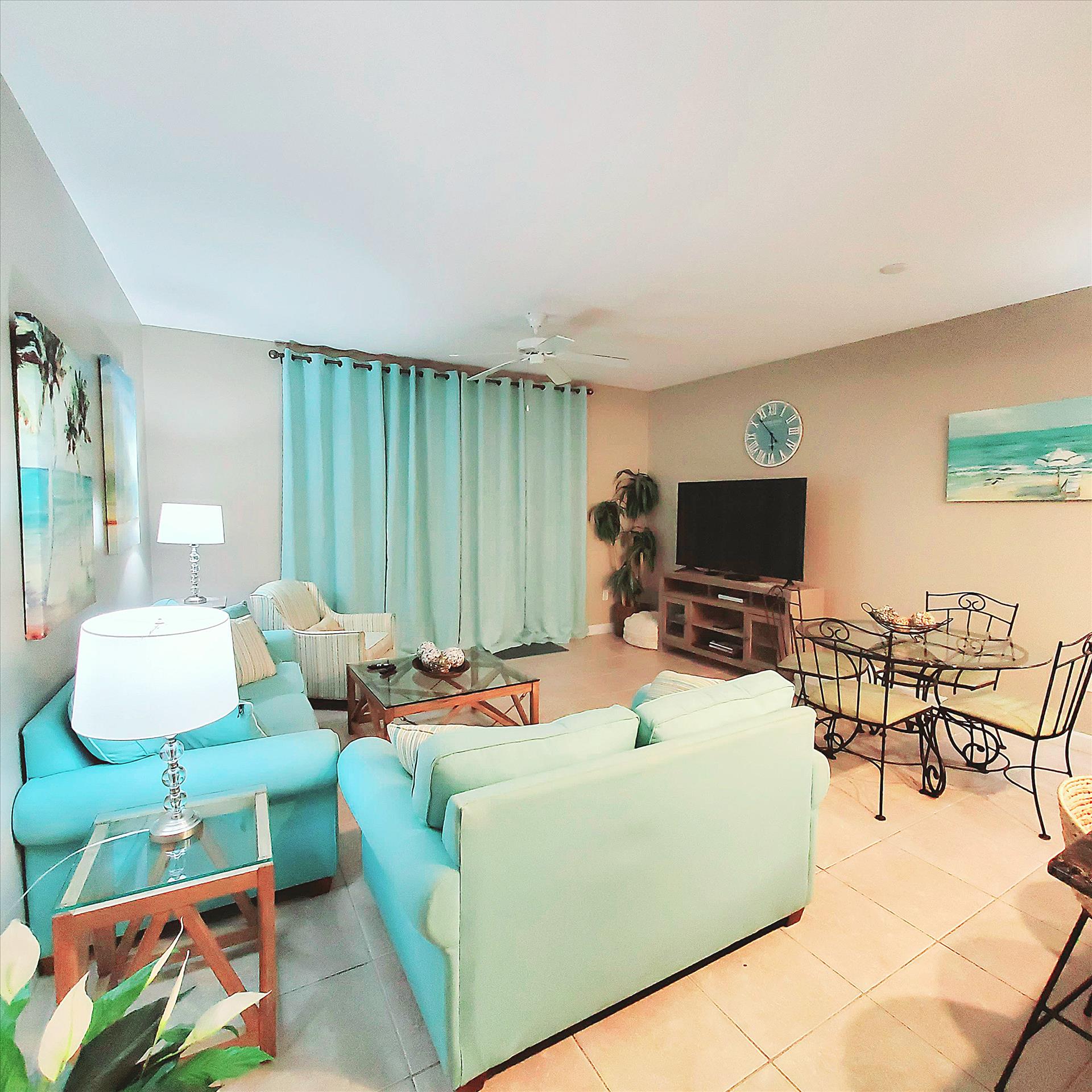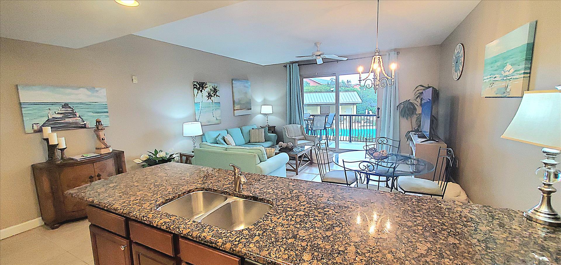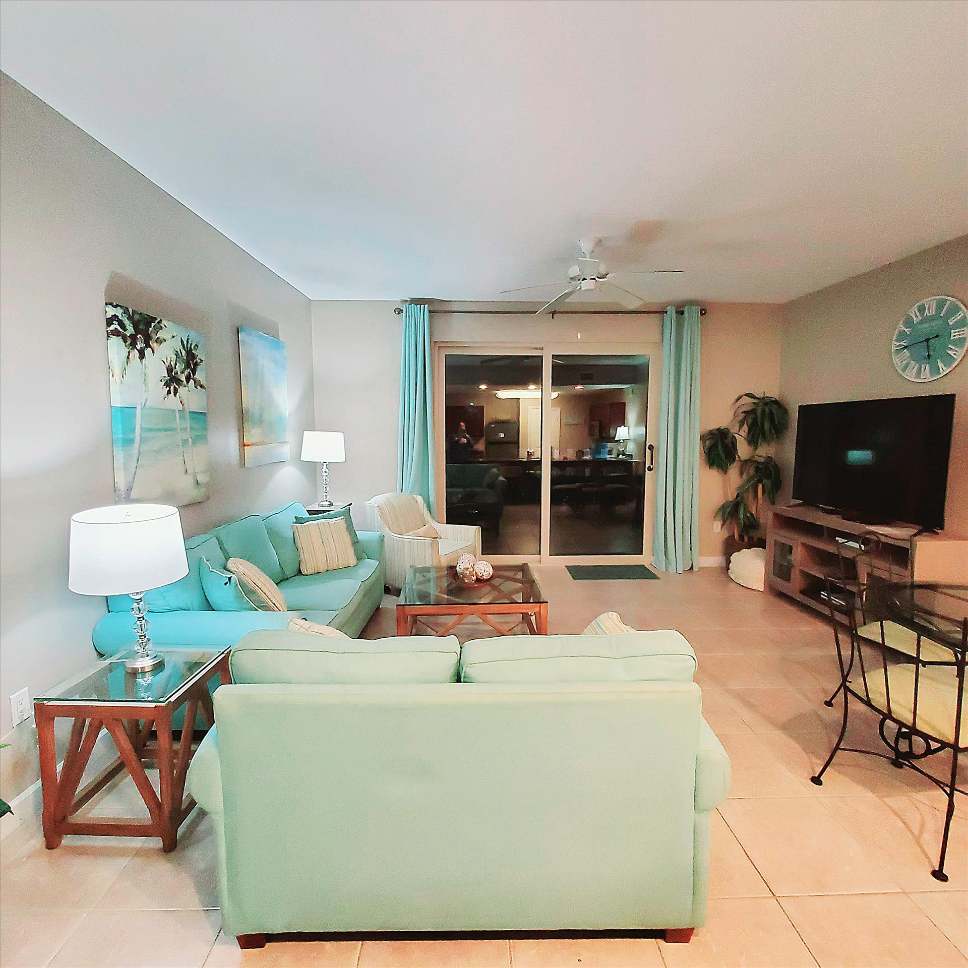 Our condo's spacious open living room features a classic coastal feel with plenty of seating, entertaining area, smart TV, dining table, and additional seating at the granite kitchen bar. The kitchen is fully equipped and has all the amenities needed to cook your favorite meals while away from home. It is an ideal place to relax after a long day full of sun and sand on the beautiful surrounding beaches, or you can choose to relax with a glass of wine on the balcony overlooking the gorgeous pools and water features while the sun sets in the distance over the horizon.